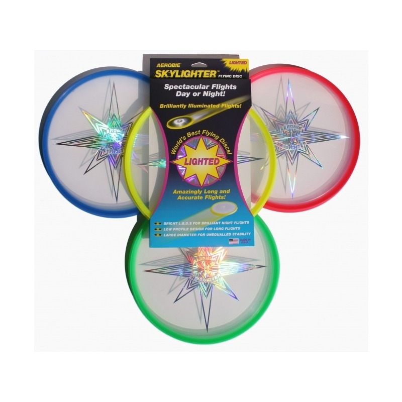 Aerobie Skylighter LED tuledega lendav ketas pakub suurejoonelisi viskeid nii päeval kui öösel. Heledad LEDid valgustavad kogu viskeketta. Vastupidavate ja vahetatavate patareidega.