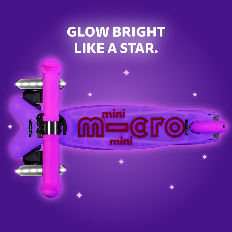 Micro Mini Deluxe Glow LED tõukeratas on Mini Deluxe mudeli täiendatud versioon, mis on päevavalguses pastelse värvusega, kuid ärkab pimedas justkui võluväel ellu ja maagiliselt hakkavad helendama nii tõukeratta seisulaud, käepidemed, pidur kui ka juhtraual asuv logo. Maagilist sära lisavad juurde LED tuledega rattad, mis muudavad lapse pimedas nähtavamaks ja sõidu lapse jaoks efektsemaks! Selle tõukerattaga särad sama maagiliselt kui täht!